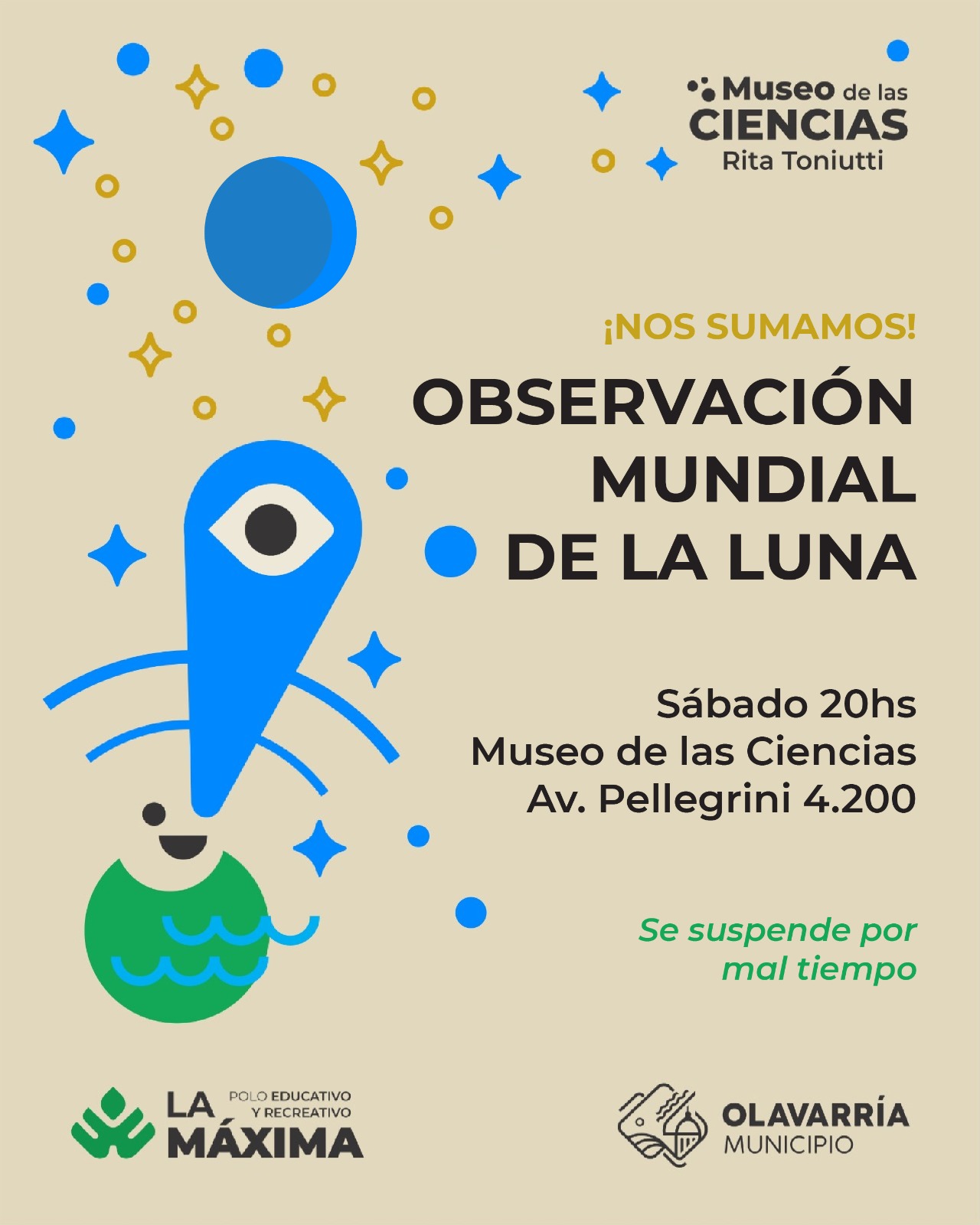 Desde el Polo Educativo y Recreativo “La Máxima” se informa que el Museo de las Ciencias “Ing. Rita Toniutti”, junto al Grupo de Observadores del Cielo de Olavarría (GOCO), invitan a una nueva Jornada Mundial de Observación de la Luna, que se llevará a cabo este sábado 4 de octubre, a las 20 horas.