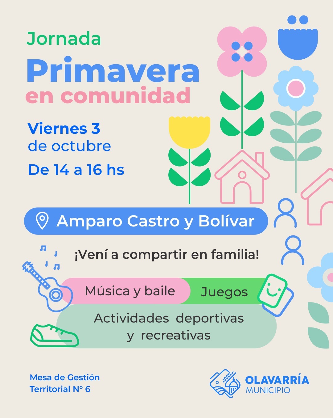Este viernes 3 de octubre, de 14 a 16 horas, en Amparo Castro y Aguilar, se desarrollará la propuesta “Primavera en comunidad”, organizada por la Mesa de Gestión Territorial 6.