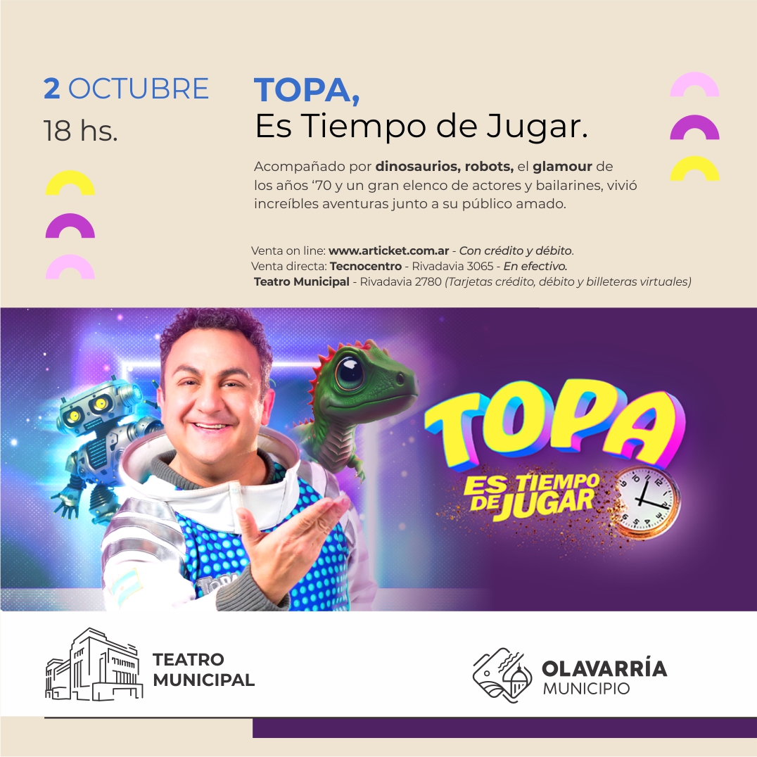 “Topa, es tiempo de jugar” fue una experiencia teatral y un viaje en el tiempo que hizo vibrar a todas las familias durante el 2023 y 2024. Acompañado por dinosaurios, robots, el glamour de los años ‘70 y un gran elenco de actores y bailarines, vivió increíbles aventuras junto a su público amado. Con gran impacto visual y un equipo creativo de lujo, esta propuesta llega a todo el país para seguir sorprendiendo y animando a chicos y grandes. Para cantar, bailar, reír y soñar en familia.