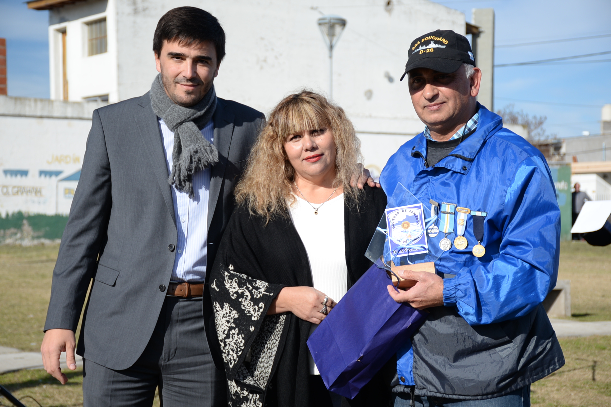 Tras la palabra del Intendente, el propio Galli junto con la presidenta de la Sociedad de Fomento Isabel Ríos, entregaron un reconocimiento a José Trinchín y el acto culminó con la entonación de la Marcha de Malvinas.