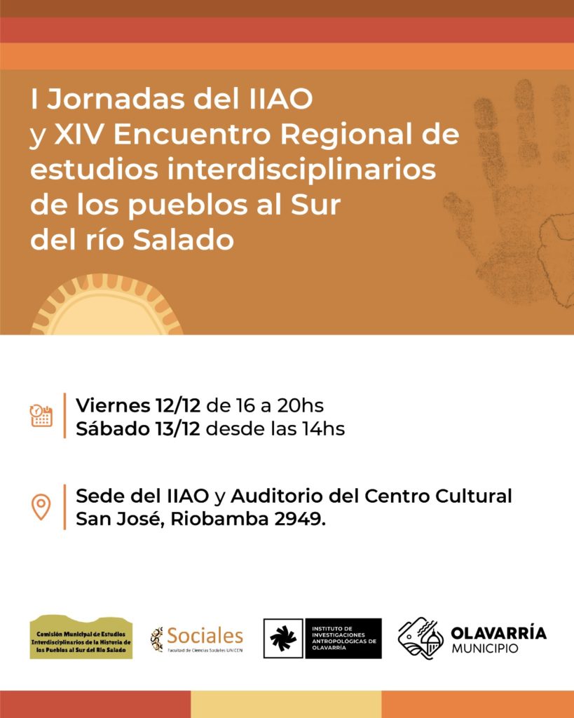 Los días viernes 12 y sábado 13 de diciembre, el Centro Cultural Municipal “San José”, será sede de las I Jornadas del IIAO y el XIV Encuentro Regional de Estudios Interdisciplinarios de los Pueblos al Sur del Río Salado.