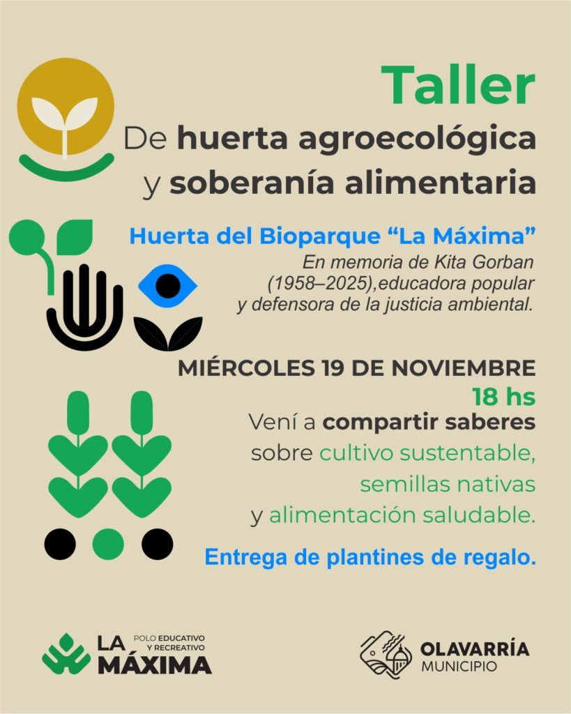 En el marco de las propuestas del Polo Educativo y Recreativo “La Máxima” se invita a participar del Taller de Huerta Agroecológica y Soberanía Alimentaria, que se llevará a cabo el miércoles 19 de noviembre.