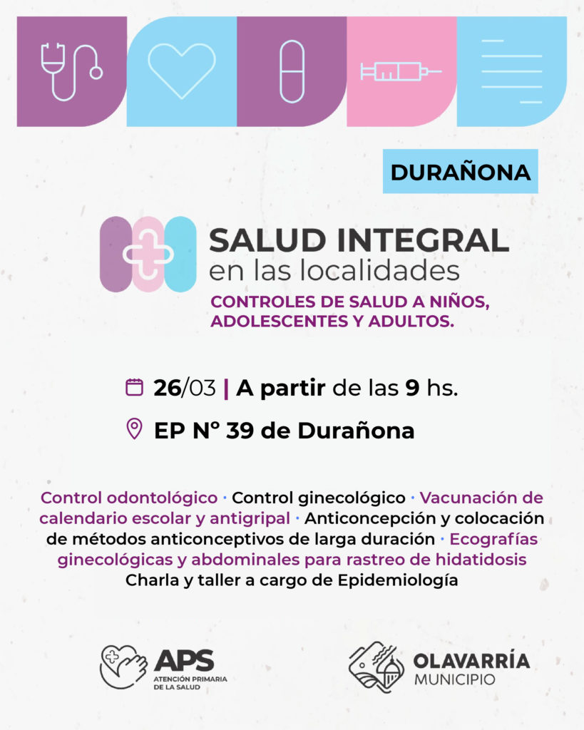 El Municipio de Olavarría informa que en la jornada del próximo jueves 26 de marzo se llevará a cabo en Durañona una jornada de salud integral, que será desplegada a partir de la acción conjunta de la Subsecretaría de Atención Primaria de la Salud, Residencia de Medicina General, de Diagnóstico por Imágenes, además de Epidemiología y el Servicio de Odontología.