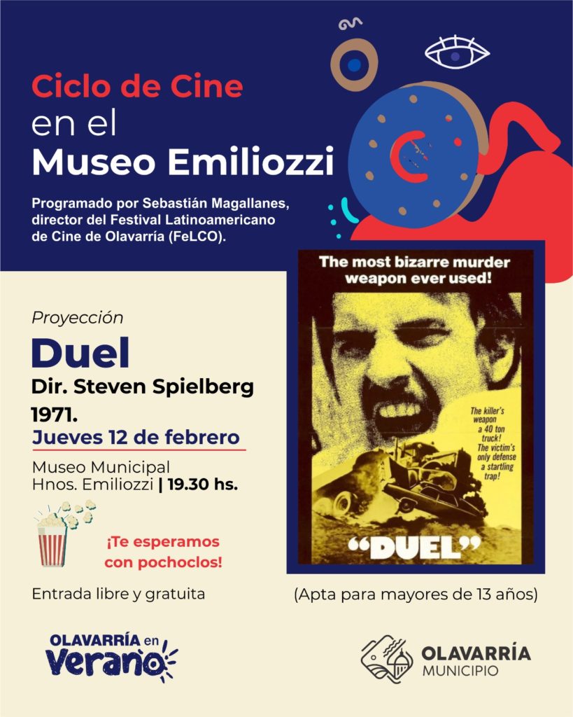 Este jueves 12 de febrero, a las 19:30 horas, se proyectará la película de acción y suspenso “Duel”, dirigida por Steven Spielberg, del año del 1971, que relata la travesía de un hombre de negocios, de clase media, por una zona desértica al sur de Estados Unidos.
