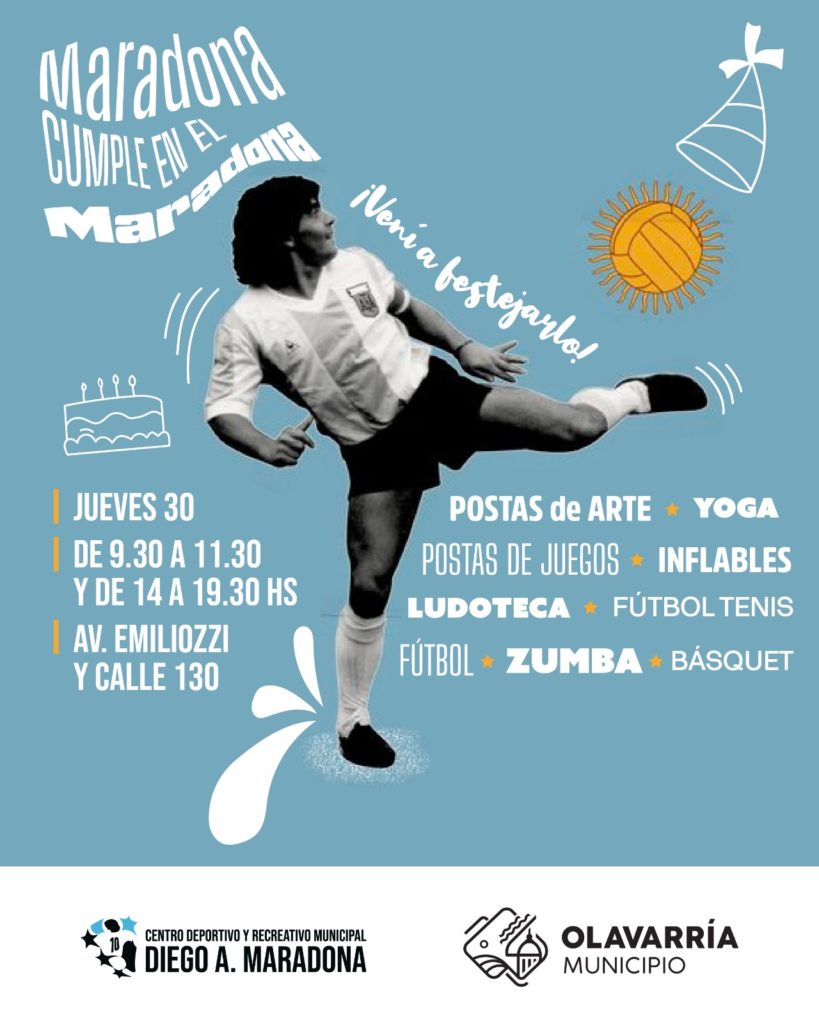 El Municipio de Olavarría invita a toda la comunidad a participar de “Maradona cumple en el Maradona”, el festejo que se llevará a cabo en el Centro Deportivo y Recreativo Municipal durante la jornada del próximo jueves 30 de octubre, fecha en la que precisamente nació “el diez”. Durante la mañana y la tarde se brindarán todo tipo de propuestas, que serán llevadas a cabo a partir del trabajo articulado de diversas áreas que integran la Secretaria de Desarrollo de la Comunidad.