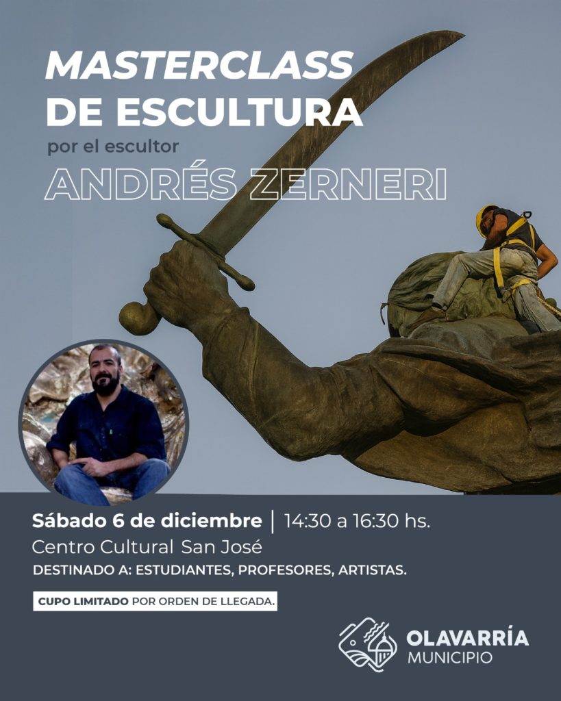 En el marco de esta actividad se llevará a cabo una masterclass gratuita de escultura a cargo de Andrés Zerneri, que tendrá lugar este sábado 6 de diciembre, de 14.30 a 16.30 horas, en el Centro Cultural Municipal “San José”. La misma está dirigida a estudiantes, profesores y artistas. Con cupo limitado y por orden de llegada.