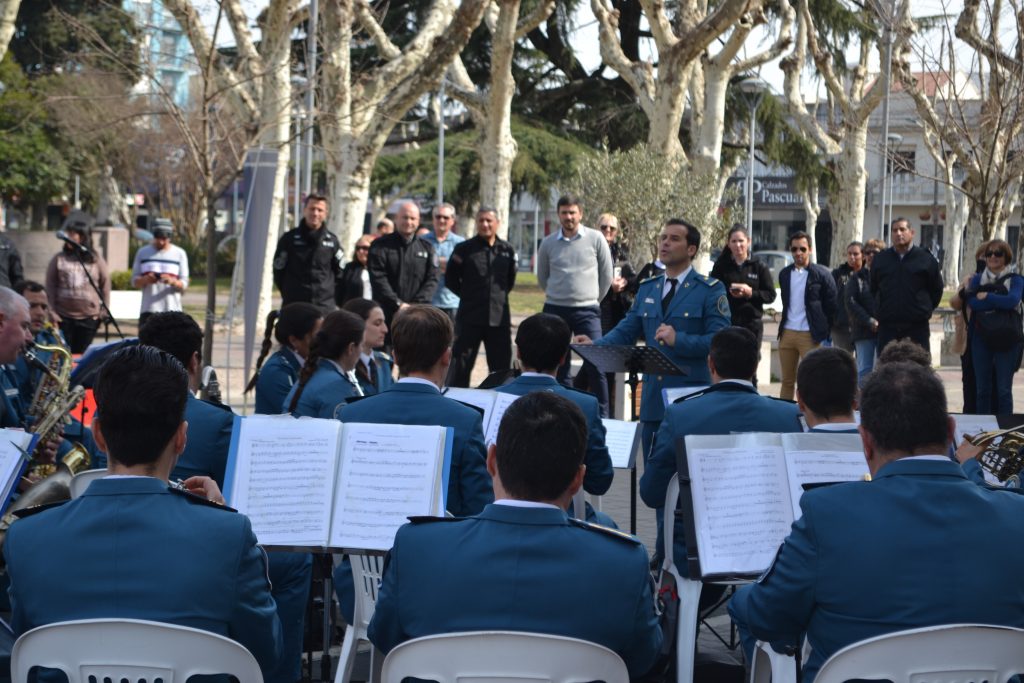 En el mediodía de este lunes, los vecinos que transitaban por el centro de la ciudad se sorprendieron al ver a la banda de la Escuela de Cadetes del Servicio Penitenciario Bonaerense en el Paseo Jesús Mendía.