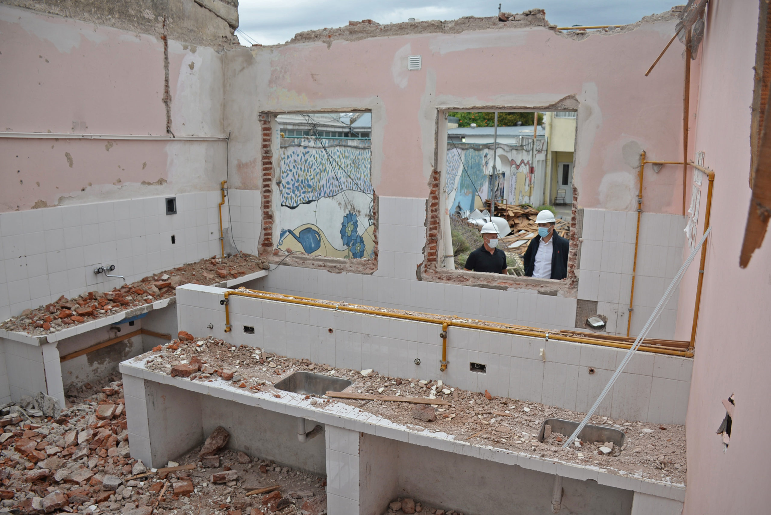 Los trabajos preliminares se iniciaron con las tareas de demolición, exceptuando la fachada, que es conservada como se encuentra en la actualidad. Luego con el desmonte y excavación del suelo para construir las bases, cimientos y la estructura de ampliación concretamente, compuesta por columnas, vigas, losas encadenado perimetral superior y dinteles, colocación del techo de chapa y canaletas.