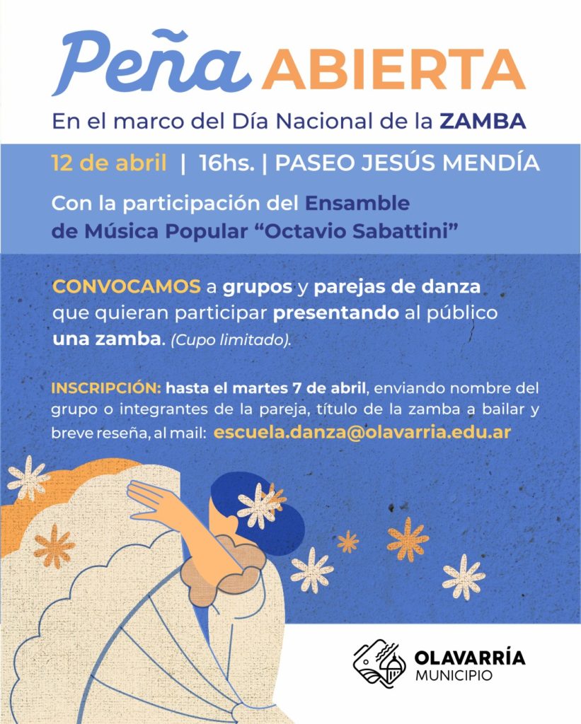 La convocatoria es abierta a toda la comunidad y aquellos grupos y parejas de danza que quieran participar presentando una zamba, pueden inscribirse hasta el martes 7 de abril, enviando nombre del grupo o integrantes de la pareja, título de la zamba a bailar y breve reseña, al mail: escuela.danza@olavarria.edu.ar. Cabe aclarar que los cupos son limitados.