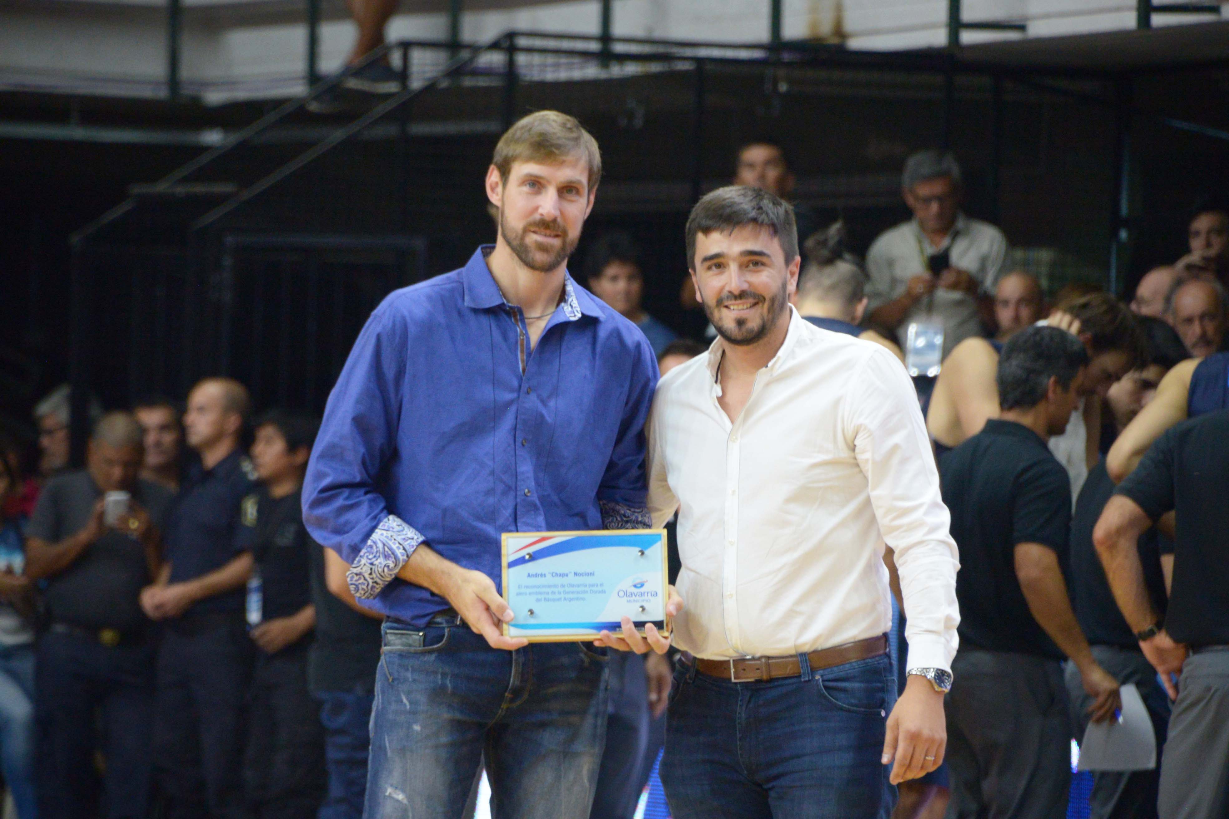 Tras el acto homenaje a Nocioni en el entretiempo, luego el intendente Ezequiel Galli le entregó un reconocimiento al alero emblema de la Generación Dorada.