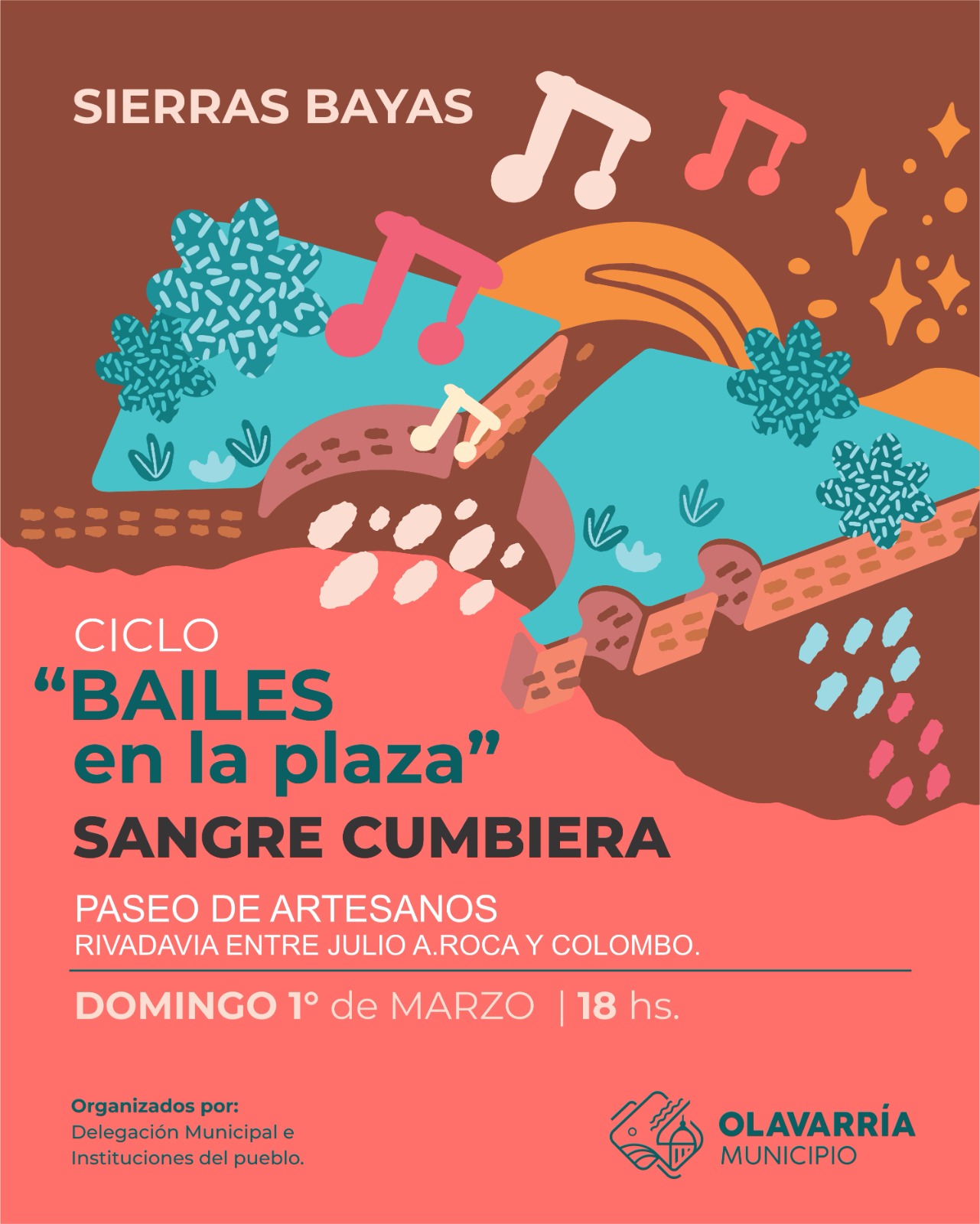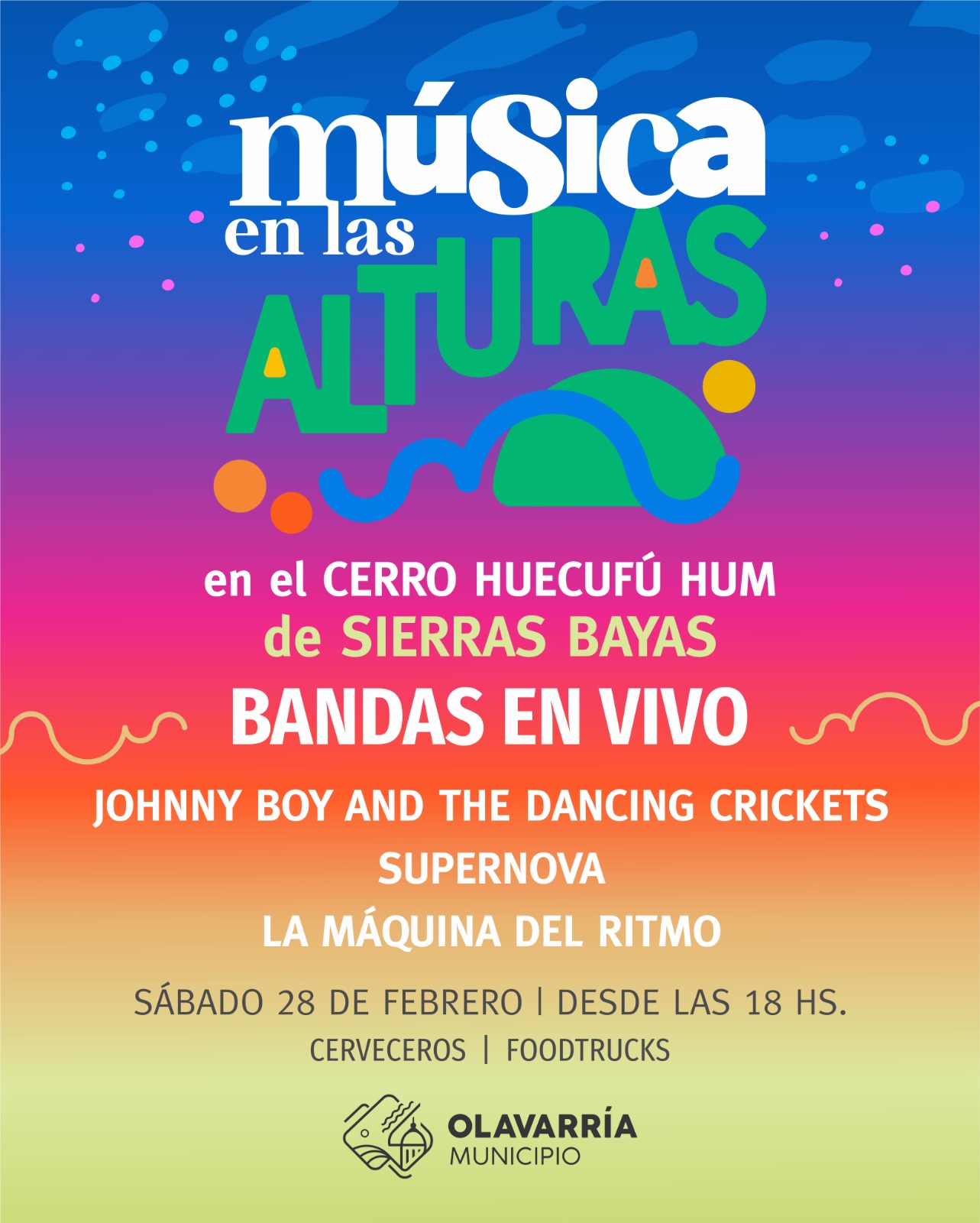 “Música en las alturas” forma parte del Programa Municipal “Olavarría en Verano” y es una invitación a vivir la música de una manera diferente, rodeados de naturaleza. Este ciclo busca conectar el arte con los maravillosos escenarios de nuestras localidades, ofreciendo al público una experiencia única al aire libre respetando el entorno y en absoluto cuidado del ambiente. Distintas empresas brindan su aporte para la concreción de esta propuesta pensada para promover la concurrencia de visitantes y el desarrollo de distintos puntos turísticos del Partido.