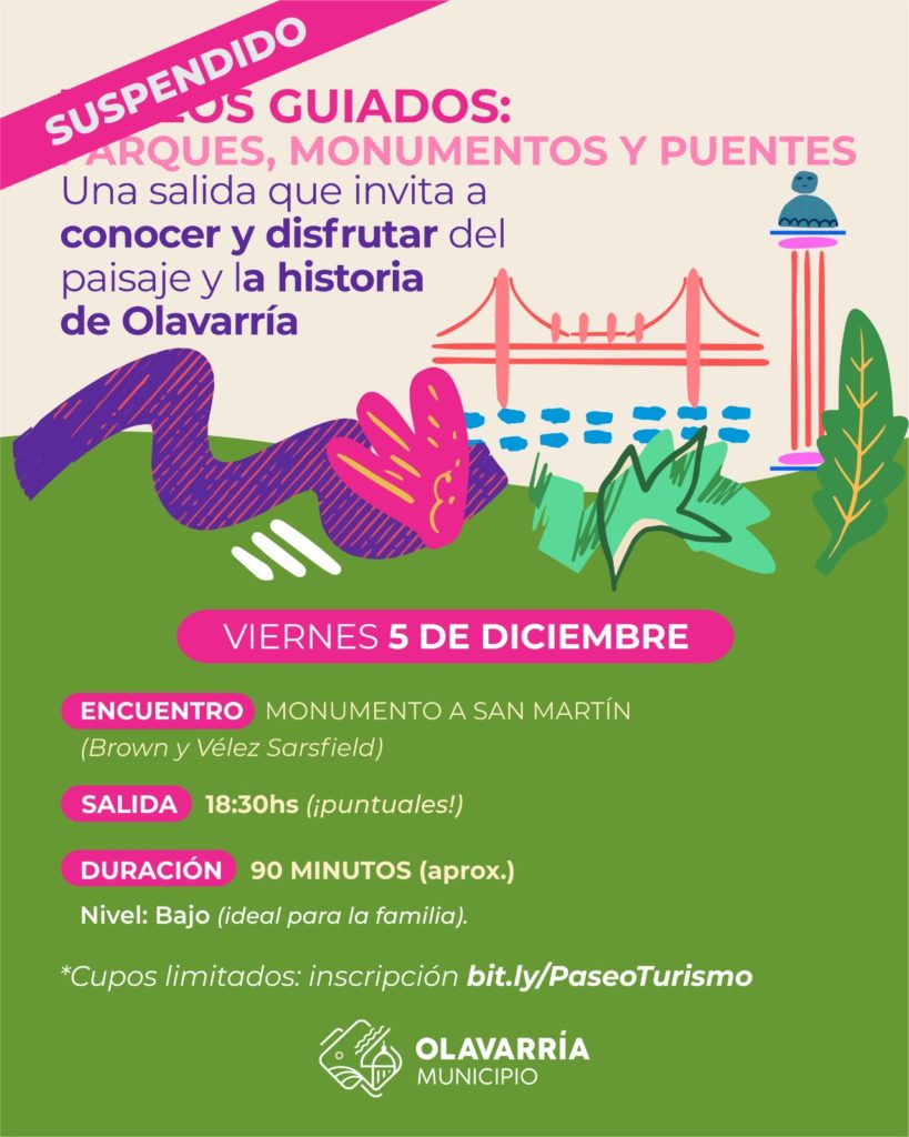 El Municipio de Olavarría informa la suspensión la salida recreativa enmarcada en el programa “Monumentos, parques y puentes”, que estaba pautada para realizarse este viernes 5 de diciembre, desde las 18:30 horas.