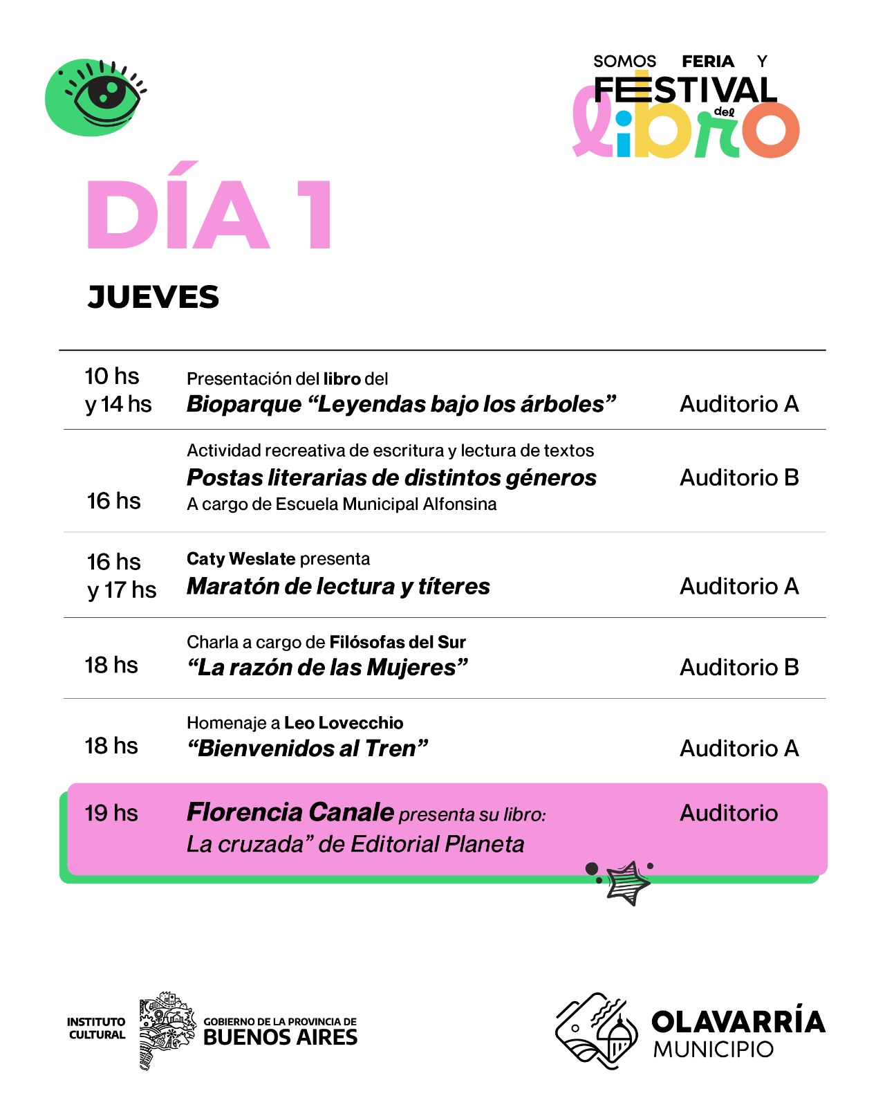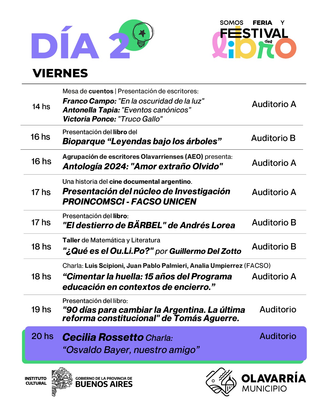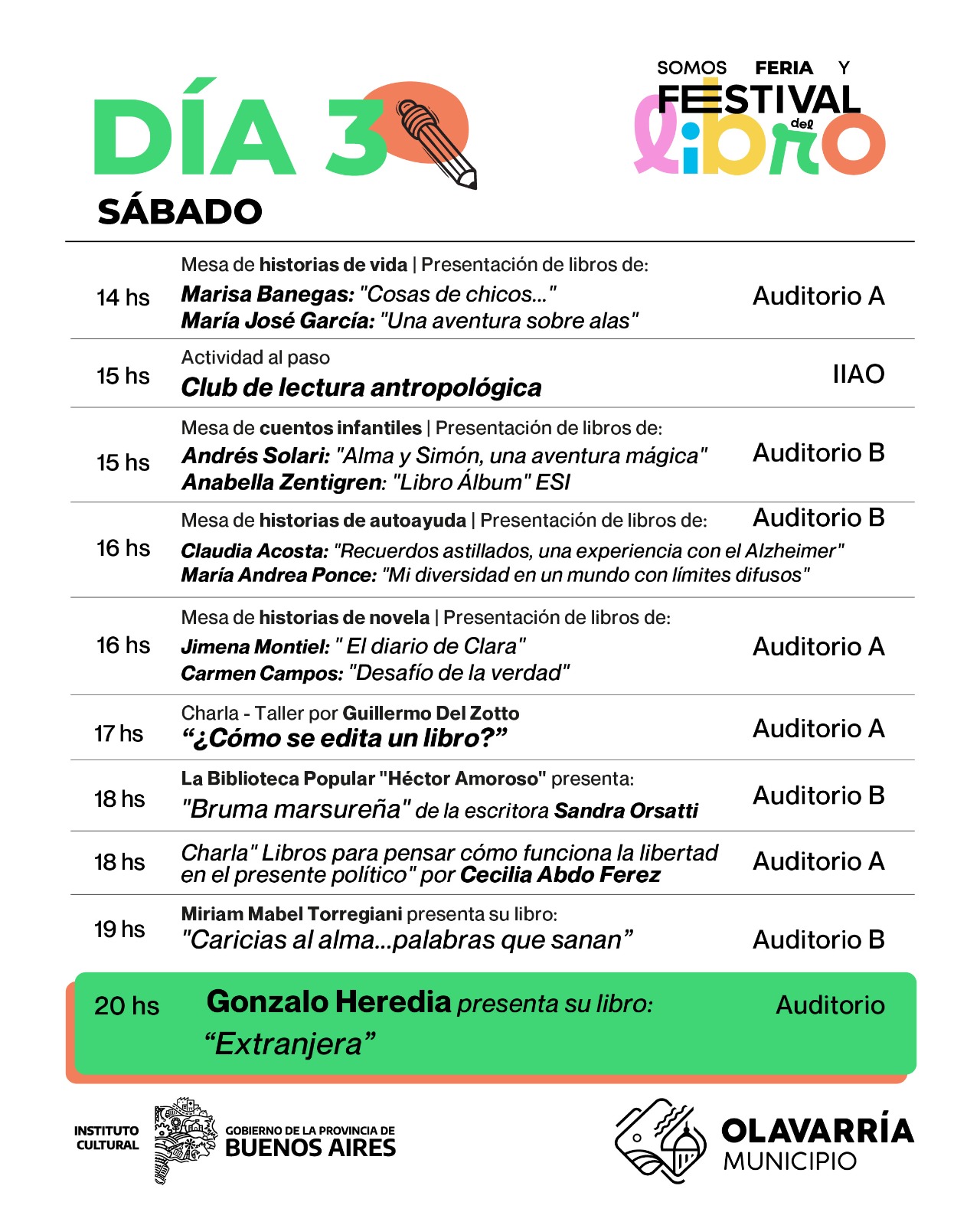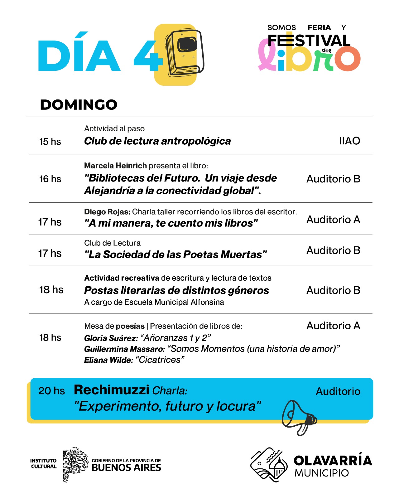 El programa de la 29° edición de la Feria Libros en Olavarría y 4° Festival del Libro continuará de la siguiente forma: