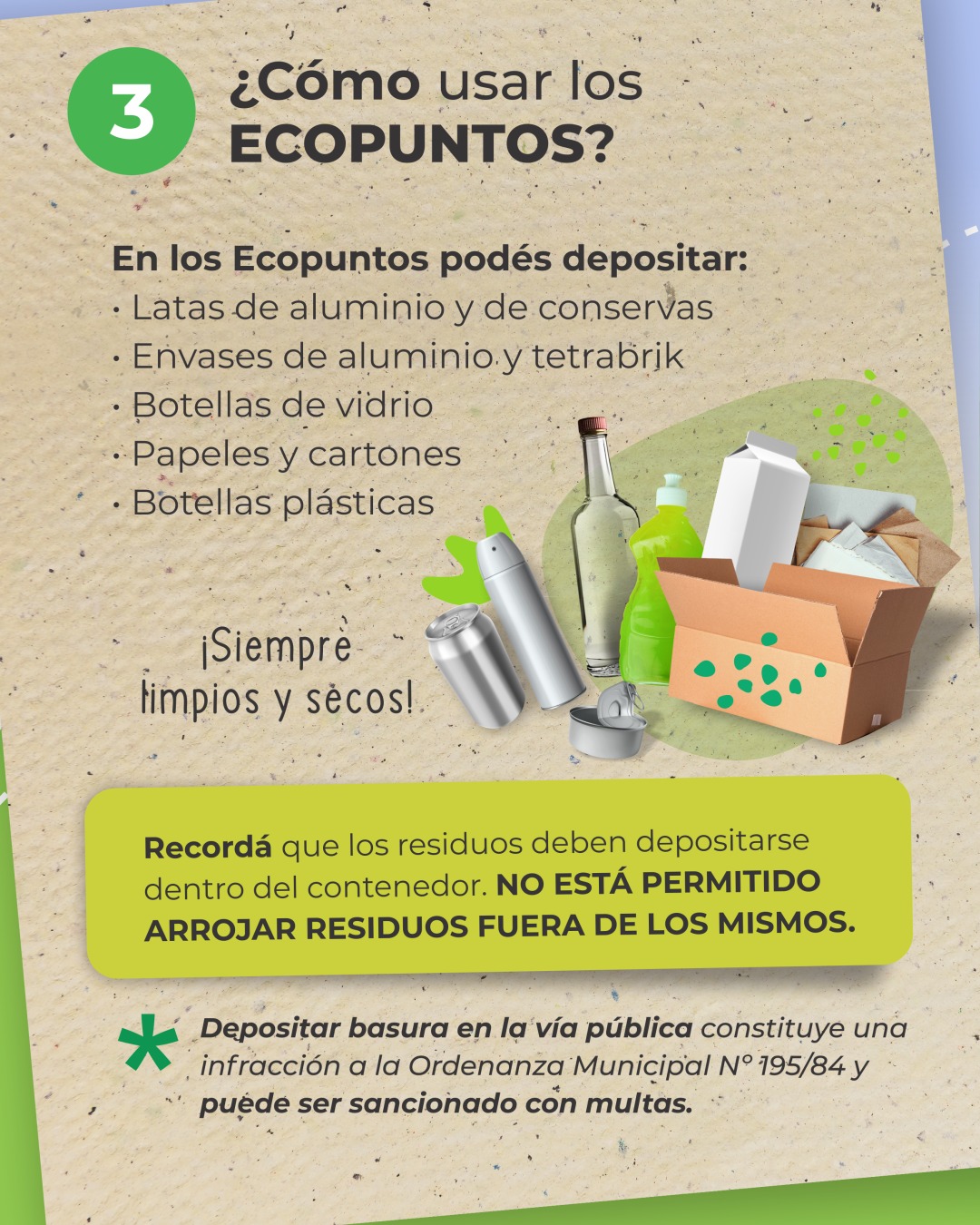 En una segunda etapa se avanzará con los Ecopuntos de menor capacidad, anteriormente denominados Puntos Verdes, que contarán con un nuevo plotteo. A partir de su reubicación, en estos contenedores se podrán disponer los mismos materiales que en los Ecopuntos de mayor tamaño, motivo por el cual se unifica su denominación. Se podrá depositar papel y cartón, botellas plásticas y de vidrio, latas y envases de aluminio, conservas y envases de tetrabrik. Durante las próximas semanas se informarán oportunamente las nuevas ubicaciones de estos dispositivos.