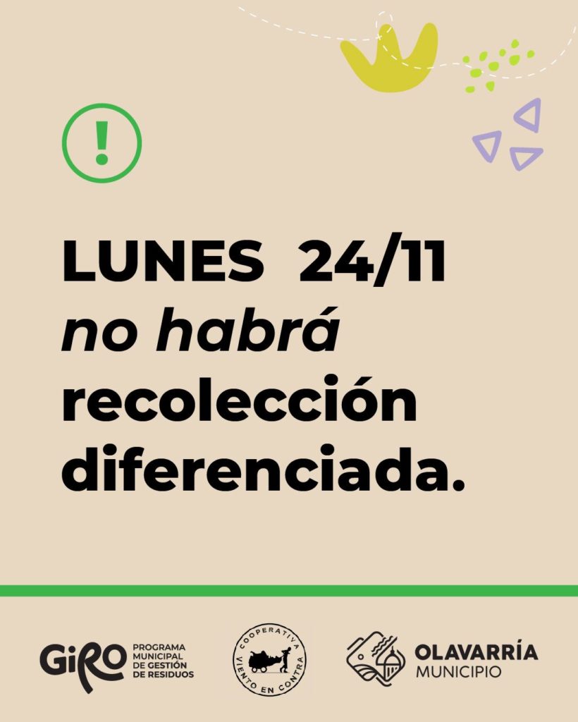 El Municipio de Olavarría, en el marco del Programa de Gestión Integral de Residuos de Olavarría (GIRO), informa que con motivo del Feriado Nacional este lunes 24 de noviembre no se realizará recolección diferenciada de residuos, como así tampoco tareas en la Planta de Clasificación.