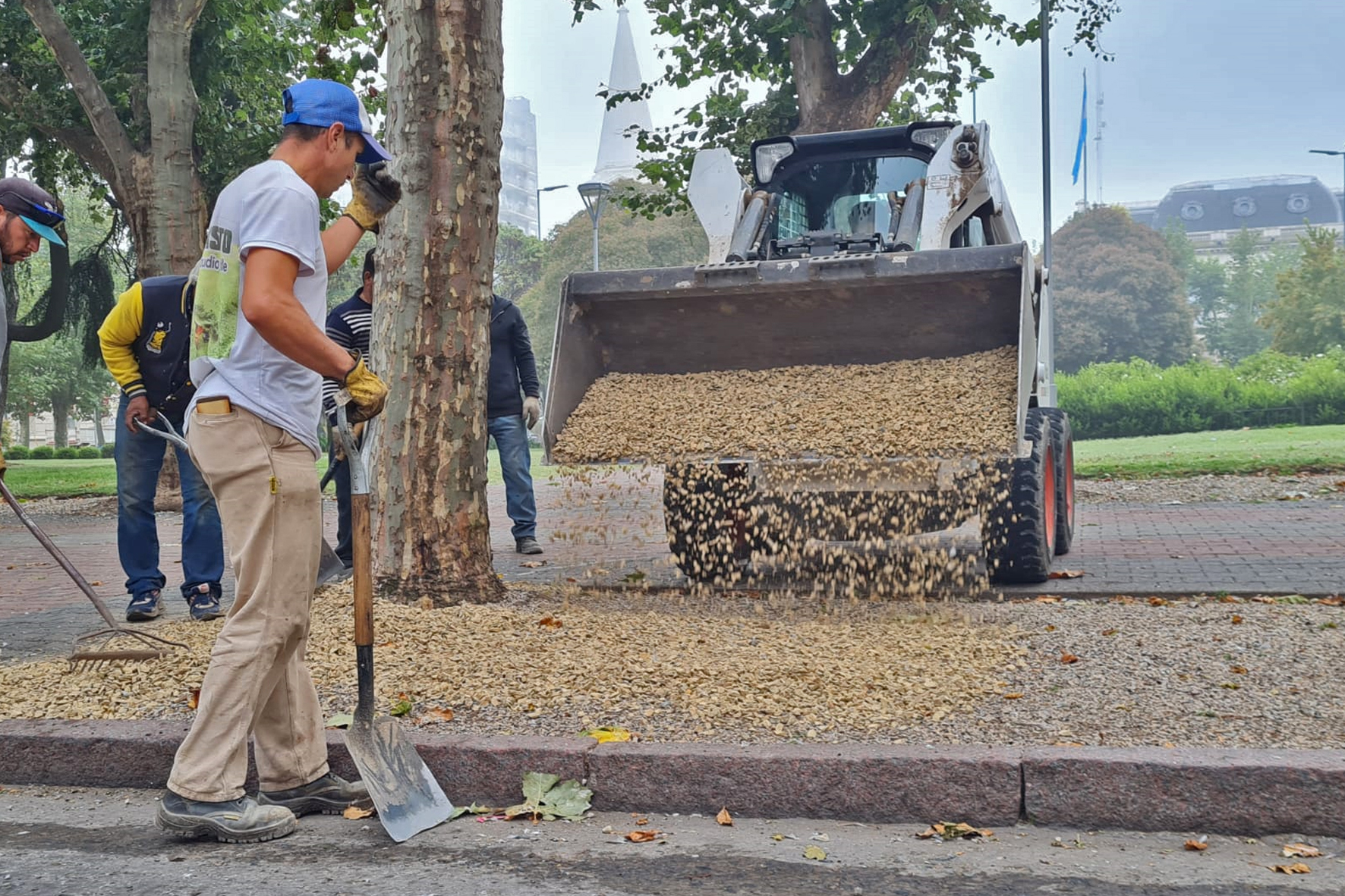 Previamente se desarrolló la poda preventiva de los árboles que circundan el perímetro de la plaza, con la finalidad de controlar la invasión de tordos en el centro de la ciudad, que dificultan la transitabilidad y el reposo en los espacios públicos.