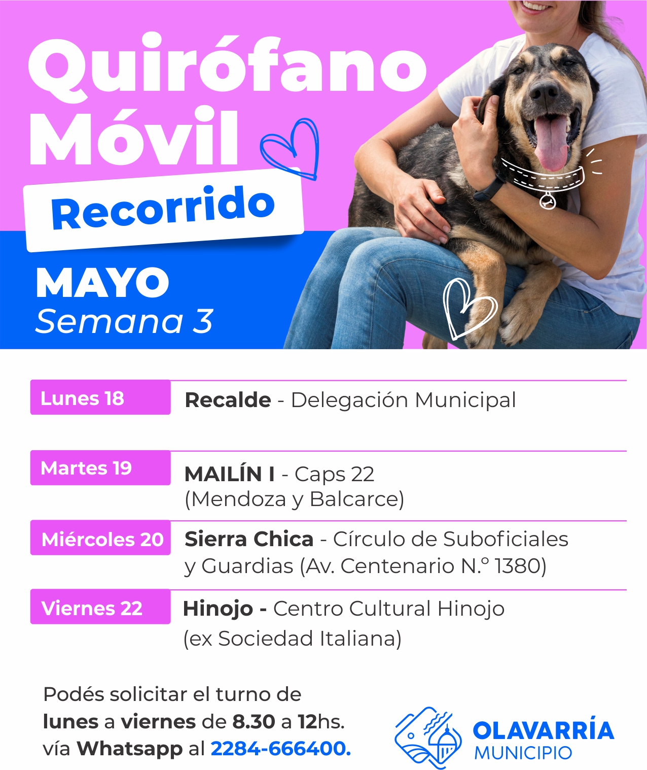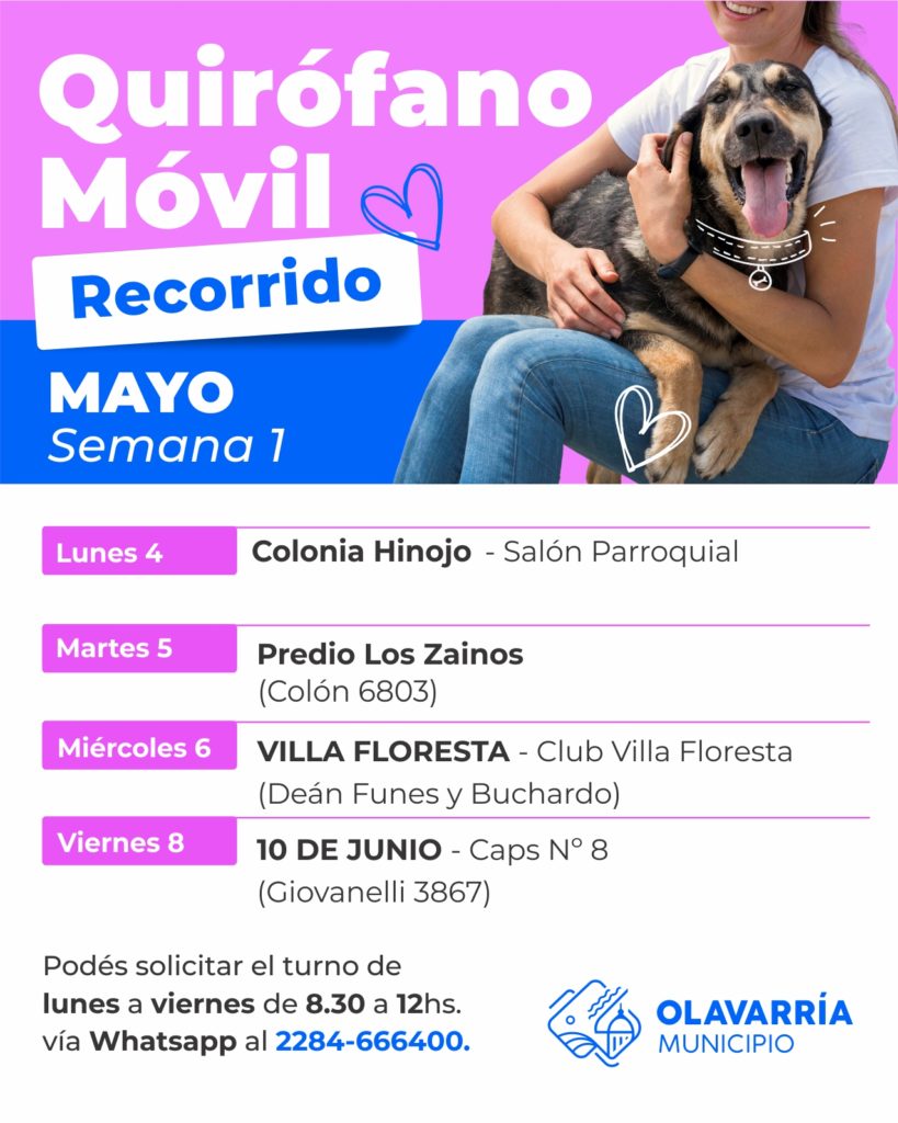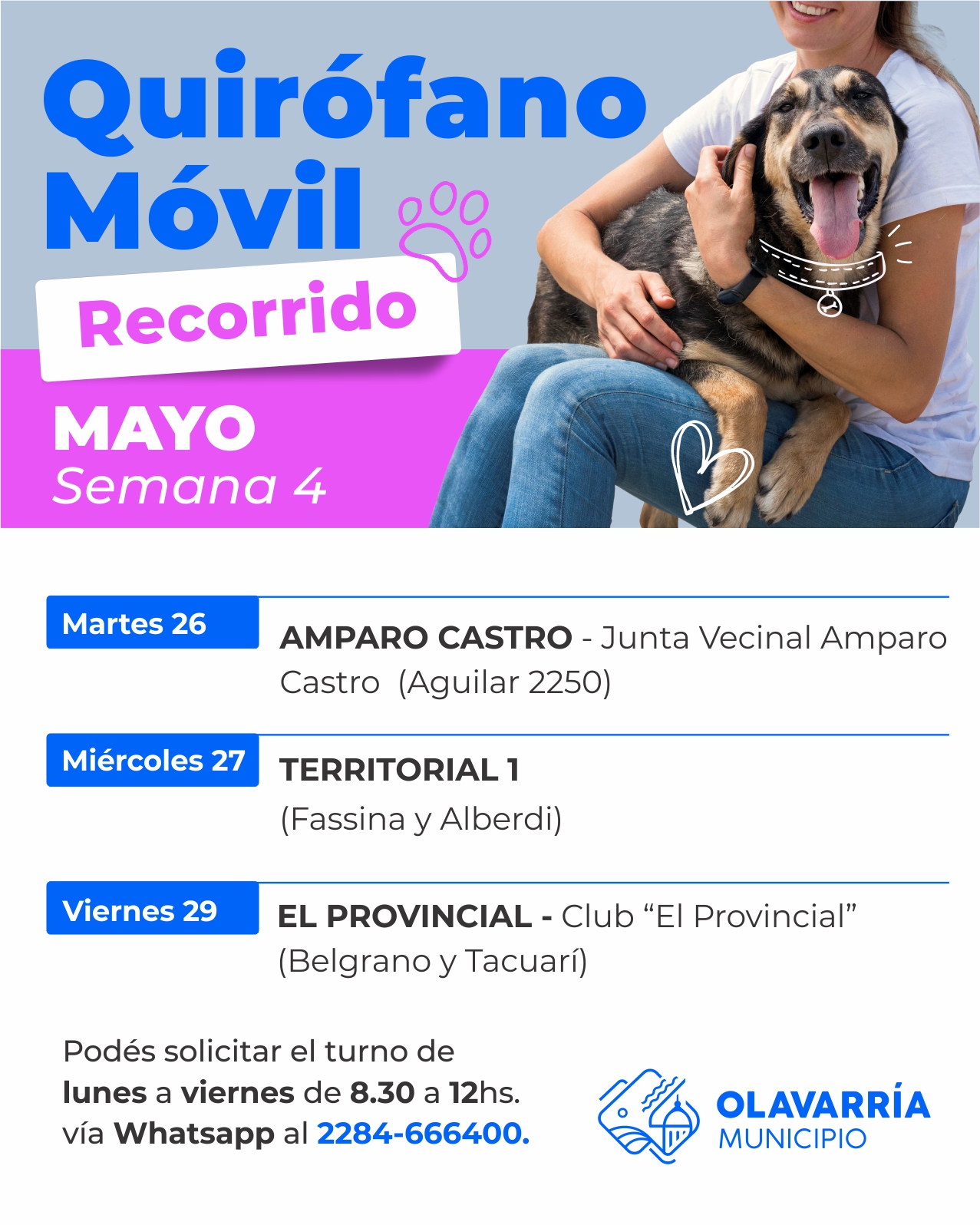 Durante el mes de mayo, el cronograma previsto para el recorrido del Quirófano Veterinario Móvil es el siguiente: