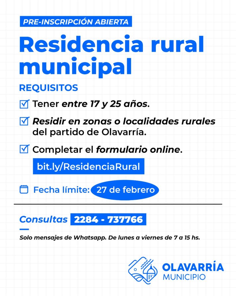 El Municipio de Olavarría recuerda que este viernes 27 de febrero concluirá el plazo para poder inscribirse en la residencia para estudiantes de localidades rurales, un espacio puesto a disposición desde el Municipio con el objetivo de promover la igualdad de oportunidades para el acceso a la educación superior y/o de formación profesional.
