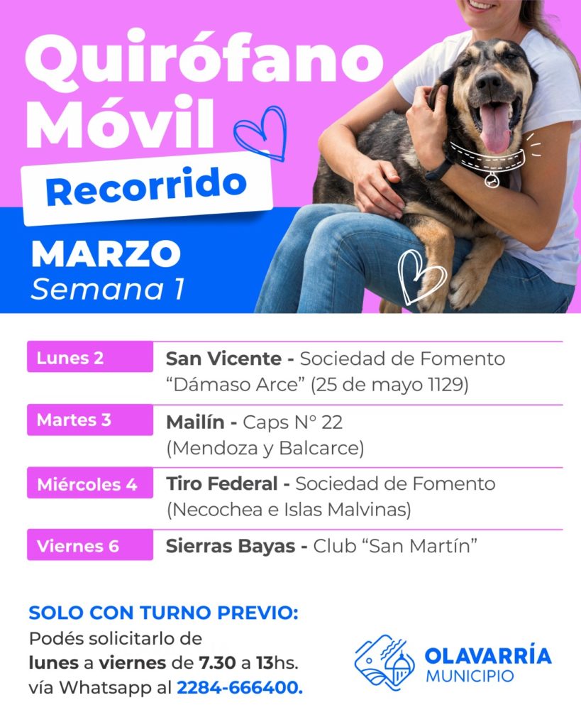 El Municipio de Olavarría informa que el Quirófano Veterinario Móvil retoma su recorrido por todo el Partido de Olavarría, ofreciendo de manera gratuita esterilizaciones quirúrgicas caninas y felinas.
