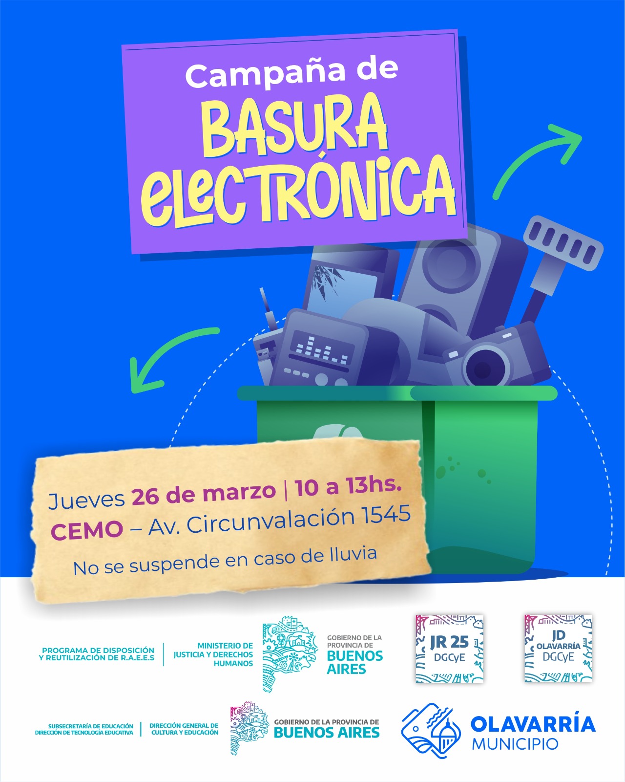 El próximo jueves 26 de marzo se realizará la primera jornada del año de la Campaña de Recolección de Residuos Electrónicos, de 10 a 13 horas, en el Centro de Exposiciones Municipal de Olavarría (CEMO).