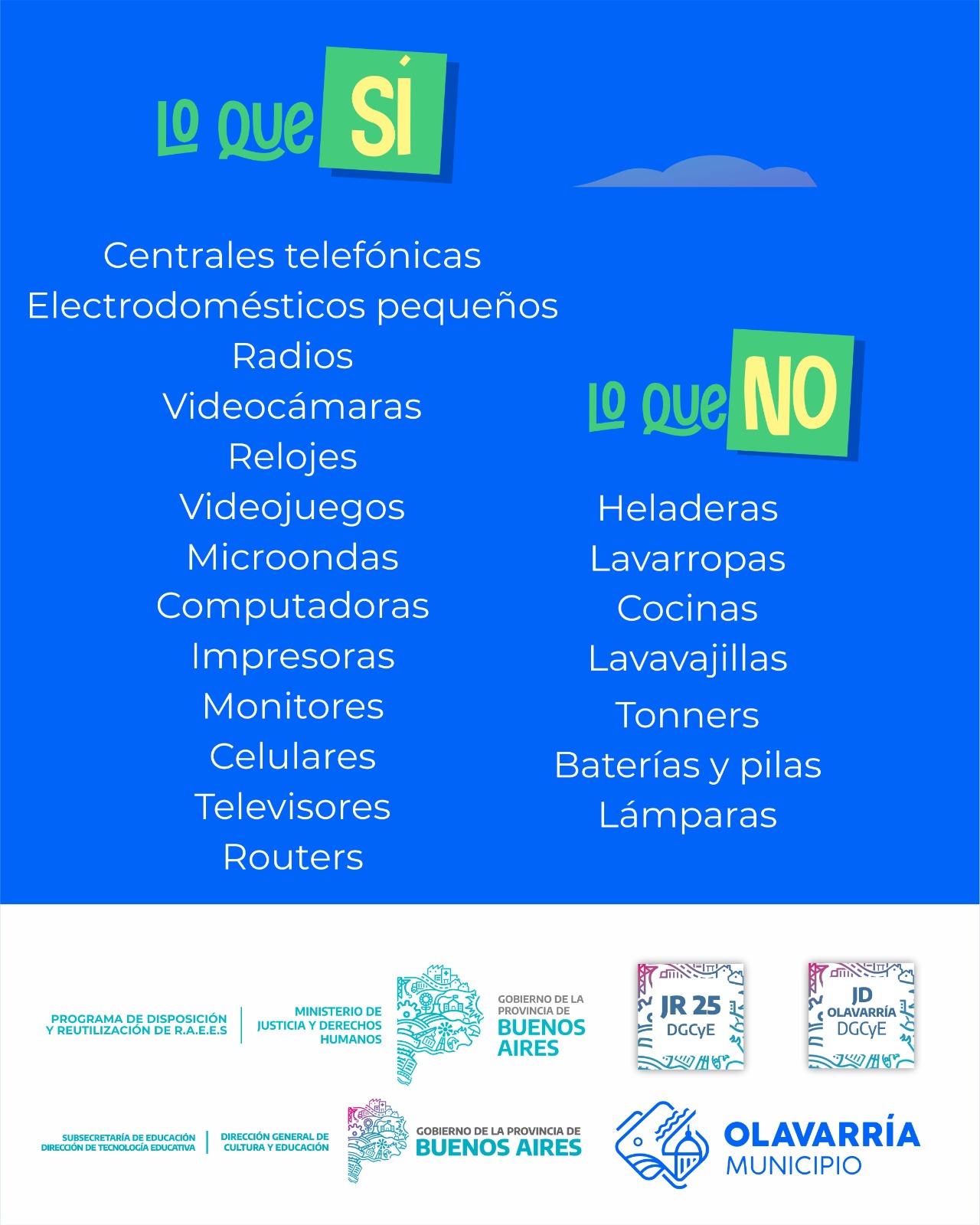 No se recibirán heladeras, lavarropas, cocinas, lavavajillas, tóners, baterías, pilas ni lámparas.