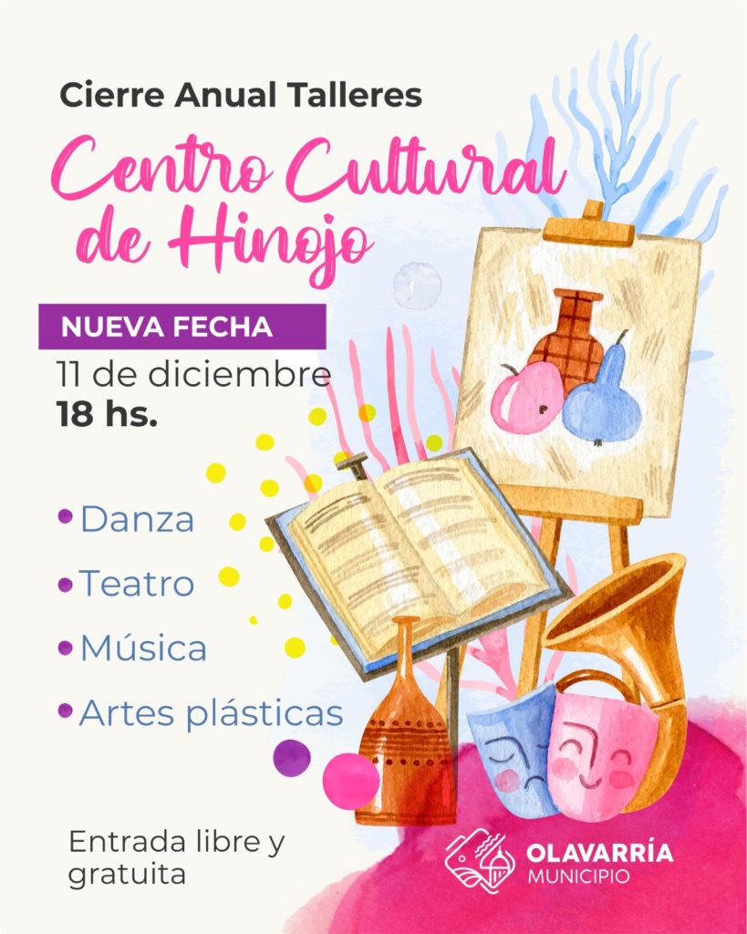 El Municipio de Olavarría, a través de la Subsecretaría de Cultura y Educación, informa que debido al pronóstico de tormentas se decidió reprogramar la actividad de cierre y muestra que se iba a concretar este jueves en el Centro Cultural de Hinojo “Delegada Dora Rodríguez”.
