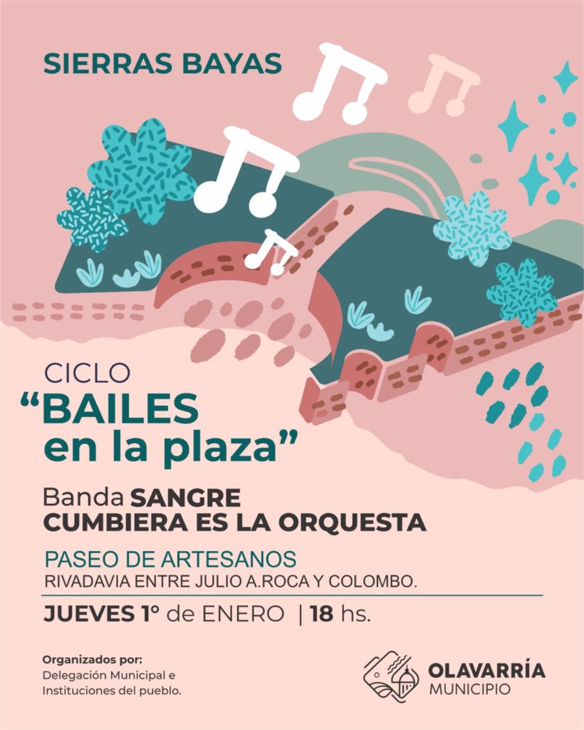 Desde la Delegación Municipal de Sierras Bayas se invita a toda la comunidad del Partido de Olavarría a participar de la próxima jornada del ciclo “Bailes en la Plaza”, que se desarrollará el jueves 1º de enero.