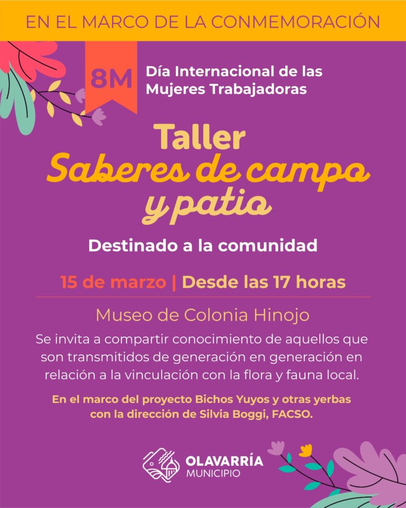 La jornada se encuentra incluida dentro de las actividades conmemorativas por el 8M: Día Internacional de las Mujeres Trabajadoras, promovidas desde el Municipio de Olavarría, y en el marco del proyecto “Bichos Yuyos y otras yerbas”, con la dirección de Silvia Boggi (FACSO).