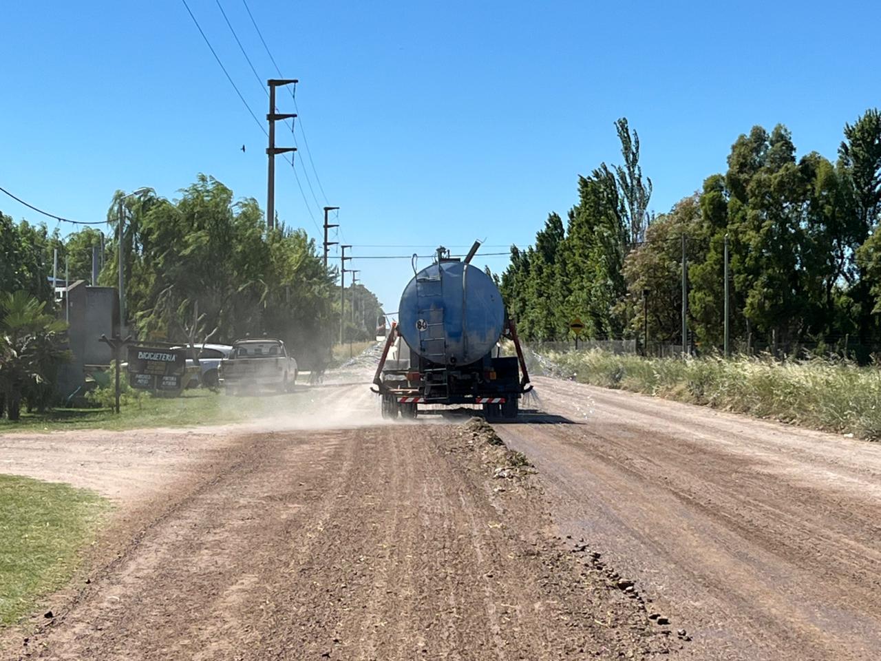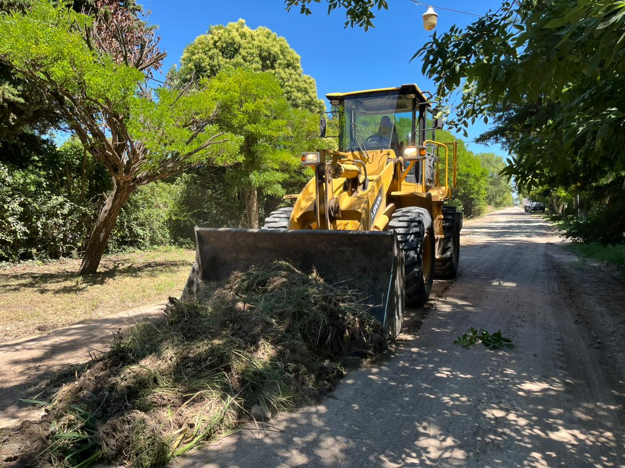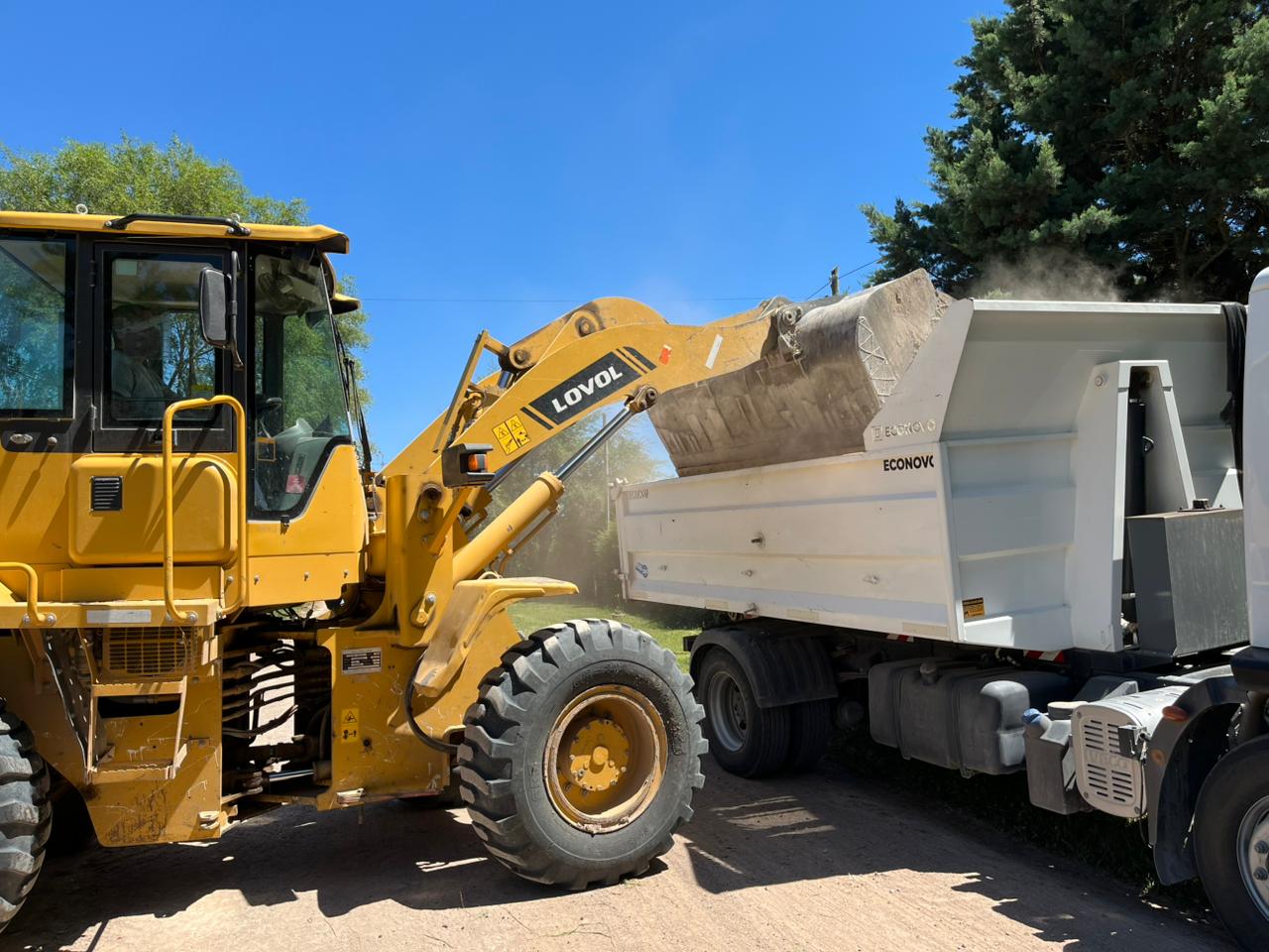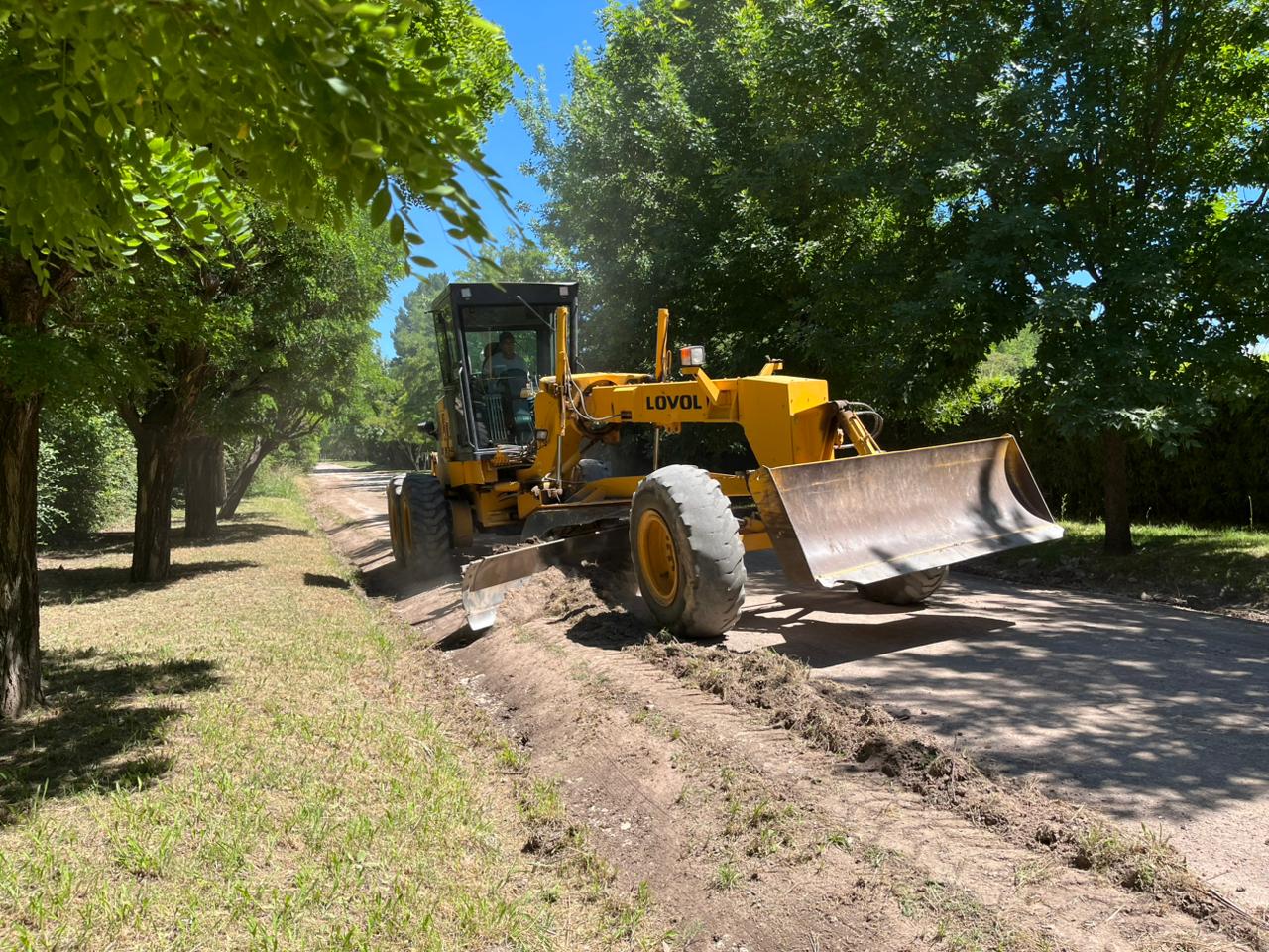 En ambos sitios las labores incluyeron también la limpieza de canales y cordones, en un trabajo articulado con motoniveladoras, camiones para el traslado y carga de materiales, y regadores.